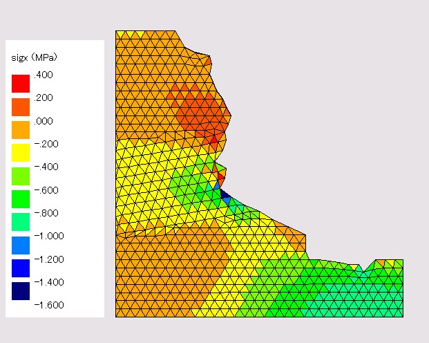 ある崖の水平方向の応力分布