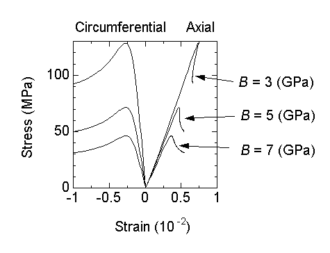 where s is stress, e is strain, B is a elastic constant and A'(e) is a modulus of elasticity which decreases with extensile strain. These constitutive equations were derived from an observation that the trace of the axial strain, circumferential strain and axial stress is almost on a plane in the three dimensional space defined by the strains and stress, and an assumption that extensile strain is mainly due to crack opening which decreases elastic modulus. The following characteristics are observed in the results of simulation by the above constitutive equations: Stress-strain curves for actual rocks can also be simulated by adjusting four constants. The critical extensile strain theory stands for the results of simulation.