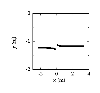 Fig. 2. Traces of tips of an inclined crack near rock surface under compression. Note that the scalings for x- and y-axes are different with each other. |