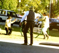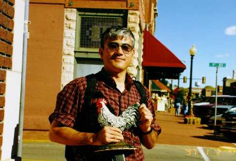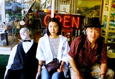 バーテン、内田さん、石田先生。バーテンは無表情である。内田さんは写真写りが悪い(実際はもっと美人だという意味である)。石田先生は西部劇の主人公になりきっていたので普段と顔が違う。 この街は古い建物が一杯あって、大変きれいである。この間来たときには馬に乗ったシェリフや観光馬車も走っていたが、今日は見かけなく残念である。アンティークショップが一杯ある。石田先生はにわとりの置物を買った。エルビスプレスリーの人形も欲しそうだったが、大きすぎるのでやめたみたいだ。