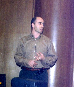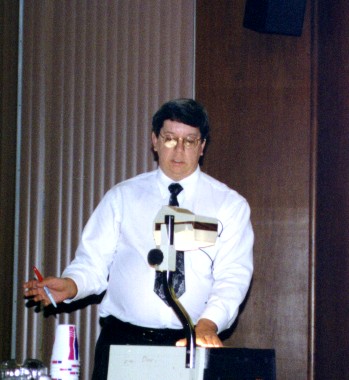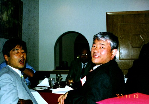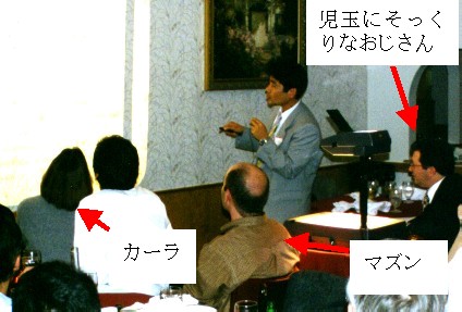 ':ダッシュというと思っていたけどプライムみたいだ。 fault sealingというのは断層が石油をトラップしていること。石油の採掘に伴って断層がずれたり、岩盤が損傷したりしてトラップが効かなくなり、石油が流出すると大変だ。断層の一方の側にクラックがたくさん発生したりいろんな現象があるらしい。 ジーンがやっているのはのこぎりで斜めに切った円柱形供試体をもう一度重ねあわせた封圧試験。角度の強度に対する影響ではなく、摸擬断層周辺の損傷とこれがfault sealingに与える影響に注目している。載荷軸と摸擬断層の角度が大きいと断層が滑るだけで、岩盤には損傷がないが、小さいと岩盤もかなり損傷する。 1日目はIce Breaker(懇親会)があった。ビールはグラスなしででてきて皆ラッパ飲みをする。ブルガリア出身の何とかいうビジティングの先生と一緒になった。彼はショーン・コネリーにそっくりだ。エネルギー関係の経済の先生で、色々と教えてもらった。 Coal Bed Methane(ミーセン)については、アメリカではすでに実用化されているらしい。図書館に行けば文献が一杯あるよといっていた。 ガスハイドレート(メタンガスが高圧低温化で水と一緒に凍った固まり)については、北海道の周りにも一杯あるよと教えてくれた。エネルギーとしては石油の100倍あるそうだ。問題は採掘方法が極めて困難なこと。石田先生が採掘方法を見つけたらショーンコネリーに電話することになっている。 ベネズエラには水より重いheavy oilというのがあるそうだ。これはサウジアラビアの石油の3倍。問題は、75%がタールであることと、硫黄が3%含まれていること。これも、石田先生が硫黄の処理方法を発明したらショーンコネリーに電話する手筈である。なお、specific gravity(比重量)だが、水は10oで石油(原油かもしれない)は32oだそうだ。Heavy Oil(重油ではない)は9o。軽くなるほど大きくなっているのだが、どんな単位だか見当もつかない。読み方はdegree。 ブルガリアの言語はBulgarian(ブルガリアン、ブルガリア語)。これはSlavicで、ポーランド語とかロシア語と似ていて、Slavicの言葉なら外国語でも話せはしないけど聞けば意味は分かるそうだ。日本の方言と同じようなものだろう。ビールはないけどワインは素晴らしいそうである。 ブルガリアの首都はSofia(辞典にはソウフィアと書いてあるがショーンコネリーはソフィアと発音)。 1997, 11/14 2日目はBanquetがイタリアンのビストロであった。6:30からなのだが皆バーにいてがんがん酒を飲んでいてさっぱり始まらない。本当に石田先生がいてくれて良かった。こんなところに1人でいたら30分くらいで耐えられないくらい疲労すると思う。当然煙草は吸えないし、車で来てるので(歩ける距離ではない)酒もほとんど飲めないし大変だ。 ようやく8:30頃にバンケット開始、メインが終わったあたりで私の発表があった。専門じゃない人もいるので、単位をできる限りpsi、ft等に変え、図面も可能な限りわかりやすくして準備しておいたものの、スクリーンは絵柄付きの壁で映りは良くない、マイクには雑音が入るは、ポインターの電池は途中で切れるはで普通なら大失敗のはずだ。ところが、実際は大爆笑のうちに無事終了した。 豊浜の話しだし、私はまじめにやったつもりなのだが、たとえば、最初に Thank you Dr. Roegiers, ladies and gentlemen. This is my first time to present in such situation like this. I try to make it as short as possible. So please pay attention to me.とまじめにただいったのだが、このplease pay attentionあたりで最初の爆笑が来る。たぶん、「なるべく短くすっから聞いてちょうよ」みたいに聞こえるのだろう。 一々書くとあまりに長くなるが、たとえば、「ある目撃者が途中で引き返した」というあたりでも、Oh, he is wise!という叫びと爆笑、温度のグラフで右側の縦軸にoFを追加しておいて、This is your temperature. This is our temperature.とやったあたりではI love your temperature!と合いの手が入って、私がThank you very much!とやるとまた爆笑である。 最初は他の客もいるし、「ディナープレゼンテーションなんてそんなものできるか」などと思い大変ナーバスになっていたが、終わってみれば大変いい経験をさせてもらったと思う。皆で盛り上げてくれたという感じであった。 amen:エーメン granite:辞典によればグレニトだがMazenはグレナイトといっていた。 スカンク発見!詳細は省くが、夜中にずぶぬれになりながら洗濯物を持って家路を急いでいたところ、行く手を阻む変な動物を発見した。猫かと思ったが、そうではない。スカンクだ!と思ったときには彼(彼女?)はすでに戦闘体勢に入り毛を逆立てていた。まずい!と思い迂回しながら何とかやり過ごした。今となってみれば、スカンクのおならがどのくらい臭いのか試してみたかったような気もするが、やっぱり洗濯物に臭いが移ると大変なことになっていたかもしれず、無事にやり過ごせて良かったと思う。 Cat Fish(なまず)のフライを食べた。チカのフライみたいな感じでおいしか