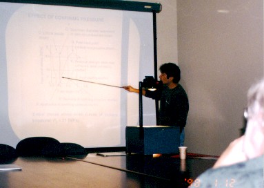 今日は引張ひずみに基づいた破壊条件について講演させてもらった。最初はジーンの朝ミーティングでひっそりとやろうと思ったのだが、JCに知られてしまい、RMI全員に知らせが回って大袈裟になってしまった。JCも来た(すでにOHPのチェックを頼んでいたので来ないと思っていた)。 朝のミーティングでジーンが「ヨシアキはここでやったことをしゃべる。すごく面白いデータだから皆見に来るように」といった。実は、そのことはしゃべるつもりがなくて用意もしていなかったのだが、まずいと思ってコピー室とオフィスの間を走りまくって10分くらいで何とかOHPを間に合わせた。ぜいぜいいいながら発表を始める。 今回は前回(ディナープレゼンテーション)とは違って、皆いたってまじめに聞いていた。一人で練習したら30分のところ、質問がたくさん入って1時間もかかってしまった。私の主張したいことには皆ほとんど興味がなくて、おまけでしゃべったAEとか非排水試験の間隙圧変化に質問は集中した(予想通り)。 JCは質問をするというよりいろいろ教えてくれた。中でもクリープローカスというのはなかなかすごい概念である。未発表なので内容をここに書けないのは残念だが、帰ったらさっそく検討してみたい。すばらしい。 私のクレジットカードのサインは日本語である。いつも英語でサインをして大抵文句は言われないのだが、ノーマンの郵便局の局員Aは、何でサインが違うんだと文句を言う。今日は局員Bだったが、試しに日本語でサインしてみたら、IDを見せろといってパスポートの英語サインと比べてなんで違うんだといわれた。結局日本語英語両方サインさせられた。クレジットのサインが日本語なのが全ての問題の元なのだが、ここを英語にしておくと日本で使うときにちょっと恥ずかしい。 明日は実験室3人組みと学生が何人かハリバートンの研究所(ダンカン)に見学に行くので、連れていってもらうことにした。できれば学生のふりをしてすませたいものだ。例によって例のごとく朝は早い。7:30に大学を出発である。今晩は冷え込むらしいのでちょっと道路の凍結が心配だが、這ってでも来なくてはならない。 garage: アメリカではガラージである。イギリス人はこの発音を好まないと辞書にある。 ハリバートンの研究所で見学したのは水圧破砕(油を使っても水圧破砕というのだろうか?)の実験装置である。写真撮影は禁止だった。 3種類のフレームで試験をしていた。小さいのは、6 x 6 x 10インチ、真ん中のは8 x 12 x 16インチ、一番大きいのは12 x 12 x 18インチだったように思う。ボアホール径は1/4 - 1/2インチ。ほとんどは石膏の模型で、傾斜したボアホールや2孔破砕等の実験もやっていた。小さいのはフラットジャッキ、その他はピストンで側圧をかける。変わっているのは、場所によって荷重を変えること。どういう意図でこうしているのかはよくわからない。 AEは計っていない。ボアホールに挿入して爆薬によりボアホール軸に直交する細い穴を穿孔(perfolation)する器具があり、ジーンはかなり興奮していた。 目的は主にEOR、でも石炭の試験もしていてこれはコールベッドメサンである(コールベッドメサンはすでに実用化されている)。石炭のときはトレーサーを入れてき裂の抽出をしていた。 こちらの目的は、曹正文君という中国人留学生の実験のヒントを得るためだったようである(水圧破砕実験時のAE計測・解析)。ちなみに、曹正文君は以前中国地質調査所で働いていて、地調の楠瀬さん等をよく知っているようである。戻ると決めてはいないが、一応、自分のポストは中国地調にキープしてあるそうで、そのために少し金を払っているそうだ。どうみても24才くらいにしかみえないが、私より少し若いくらいらしい。研究熱心で人柄明るく岩力の知識も豊富なので日本の大学の助手にいいような気がするが、日本語はできない。