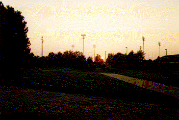 アパートから見た夕焼け。照明塔が見えるがこれは野球場のものである。 |