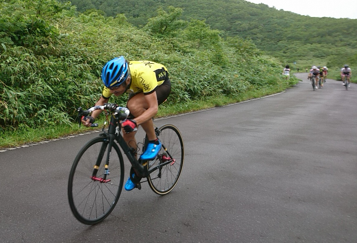 2018, 8/5 ニセコヒルクライム 63 kg、中華カーボン24 mm、シュワルベワン+コルサG、10気圧、11-30 t、岩力ジャージ、ストラディバリウス 0500起床、0620発。0640に18条で山本・大宮君を乗せ、銭函でおにぎりを2個買い、食いながら0820着。もらったアミノバイタルを食って2RUNを入れ0900-0930アップ。コパトーンの日焼けオイルを塗り、もらったアミノバイタルを食い2RUNを入れ、エリートの最後尾付近を確保し、荷物を預け、立小便をしてスタンバイ。 昨年同様6 kmくらいで無理せずちぎれ、結構抜かれたが34 x 30でくるくる回して後半やや戻し、片桐君に、後ろから来てる、とだまされて小野田坂道をイメージしたヒルクライムとは思えぬ下ハン回しまくりの必死の逃げでゴール。