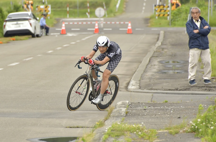 2025, 6/22 38/32、59 kg、DHバー、中華カーボン50 mm+ 80 mm、コルサG、6気圧、11-25 t、中華激安エアロスーツ、スーパーレゲラ。 スタートとコーナー立ち上がりは400 Wで100 m踏んで巡航は276 W。当然だけど、最後は全力でゴールスプリント。という作戦。100 mというのは、私のサイコンでは測れないので、適当だが、クランク14回転とした。 頭がキチガイになってしまい、第3コーナー前までは決めたパワーで抑えられない。追い風でスピードが乗ってしまった第3コーナーでブレーキングしたあとは、しばらく決めたパワーに達しない感じだったが、ゴールスプリントはまあまあできたかも。