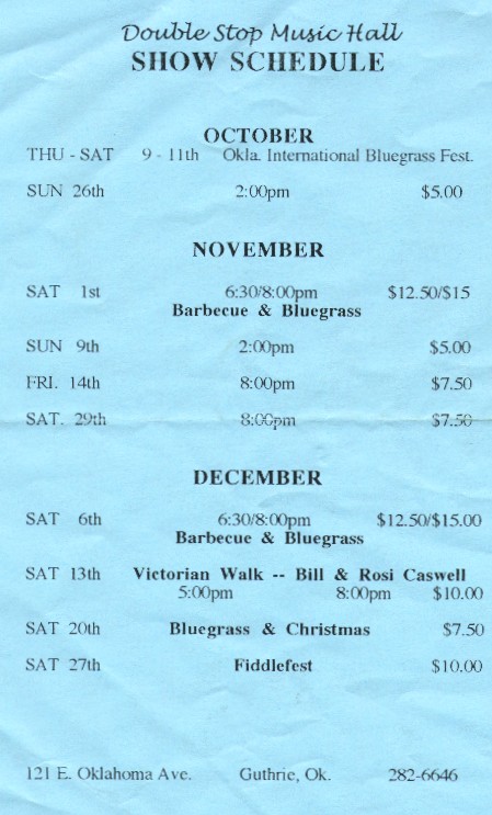 先月のT. K. Grass定例のライブに木山さんと福原さんにお手伝い頂きました。 初めは長い間弾いていないということで断られましたが、「バン ドの音やライブの運営にはシビアなものはほとんどないので気楽 に参加してください」ということでお願いしましたら、しぶしぶ の承諾。しかしながら、どうしてどうして、ブランクを感じさせ ない演奏でお客はともかく、バンドメンバーはすっかり楽しんで しまいました。しょうもないバンドですから、お二人のリハビリ のお手伝いが充分にはできなかったかもしれませんが... そんな訳で、T. K. Grassではリハビリ希望者募集中です。メールをお待ち申し上げて おります。毎月最終金曜日(ただし11月は都合により第三金曜日 に変更)に突然でも結構。土浦市ステーキハウスクックバーンで (上野駅から常磐線で1時間、土浦もしくは荒川沖までお迎えは可 能です)... 久々に,ブルーグラスにふれる機会がありました。 つくばの森下君から連絡があり,「つくば市内のステーキハウスで月1回ライブ をやっているが,今回マンドリン弾きが来れないので手伝ってくれ」,「弾くのは 無理だが,とりあえず楽器を持っていく。それとつくばに福原さんという先輩が最 近引っ越したので紹介する」。 10月31日の金曜日,くだんのステーキハウスに 。千葉大のOBでわたしより7・8歳上の有海さん(g)と**さん(b)。7時 のステージ,お客さんがちょうどいなかった。これはジャムと同じ状態。ステージ に揚がってしまった。左の指先に角質化したものがないのですぐ痛くなるが,久し ぶりのジャムは,まったく思うように弾けないのにとても楽しい。いろんな曲をや ったが,でもブルーグラスは便利だ,たいてい知っている。お客が1組入ってきた 。でも,もう構うものか,やっちゃえ。30分のステージはあっという間に終わり ,休憩。福原さんも来た。 次のステージは8時。客は2組。厭がる福原さんを引き ずるようにステージへ。どうせ私と同じ,すぐに気にならなくなるに決まっている のだから。福原さんも弾けない,が,やはり楽しそうである。休憩時間は,お駄賃 のステーキと飲み物。つまりこれがギャラである。9時のステージは4・5組は客 がいたが,もう怖いものは何もなかった。楽しい夜であった。 オクラホマのガスリーにあるDouble Stop Fiddle Shopというバイロンの店に行ってきました。マンドリンはギブソンとケンタッキー、バンジョー、ギターも少しあって、フィドルは多量に在庫していました(あたり前か)。バイロンはとても優しいいい人でした。この店には大抵バイロンがいるらしいです。2階ではライブもやっています。 *関連記事はここの下の方