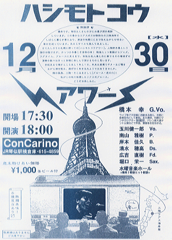そんな大沼さんに耳よりな行事があるじゃないですか。そしてこれを御覧の皆様にも ! 12月30日(水)午後6時、JR琴似駅横倉庫にて「ハシモトコウ・アワー」開催予定であります。いつものブルースなど、いろいろと演ります。年忘れライブです。私自身、帰省を兼ねてのライブなので一体どうなることやら分かりません。 是非!
