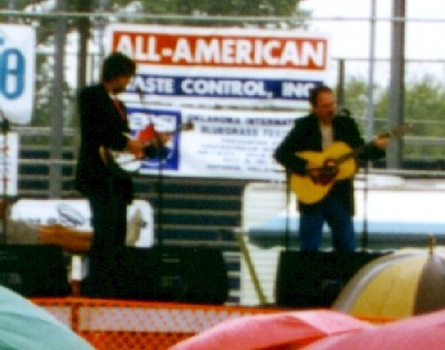 次に、Jim & Jesseをみた。最初に、2nd. Md.の16才の坊や、bj、エレベが出てきて、マイクのセッティング等をする。黒い背広に真っ赤なピカピカをつけていて思わず「お〜〜」と口走ってしまった。しかしこれは序の口である。時間になってJim & Jesseが出てきた。真っ赤な背広に真っ赤なピカピカである。髪は明らかに染めているような(染めているだけではないかもしれない)真っ黒のピカピカである。マンドリンは白木のような色でピックガードが付いていてかっこいい。ここで思わず「うお〜〜」と再度口走ってしまった。会場があまりに暗くて写真が撮れなかったのが大変残念である。こんなことなら三脚でも持ってくればよかった。