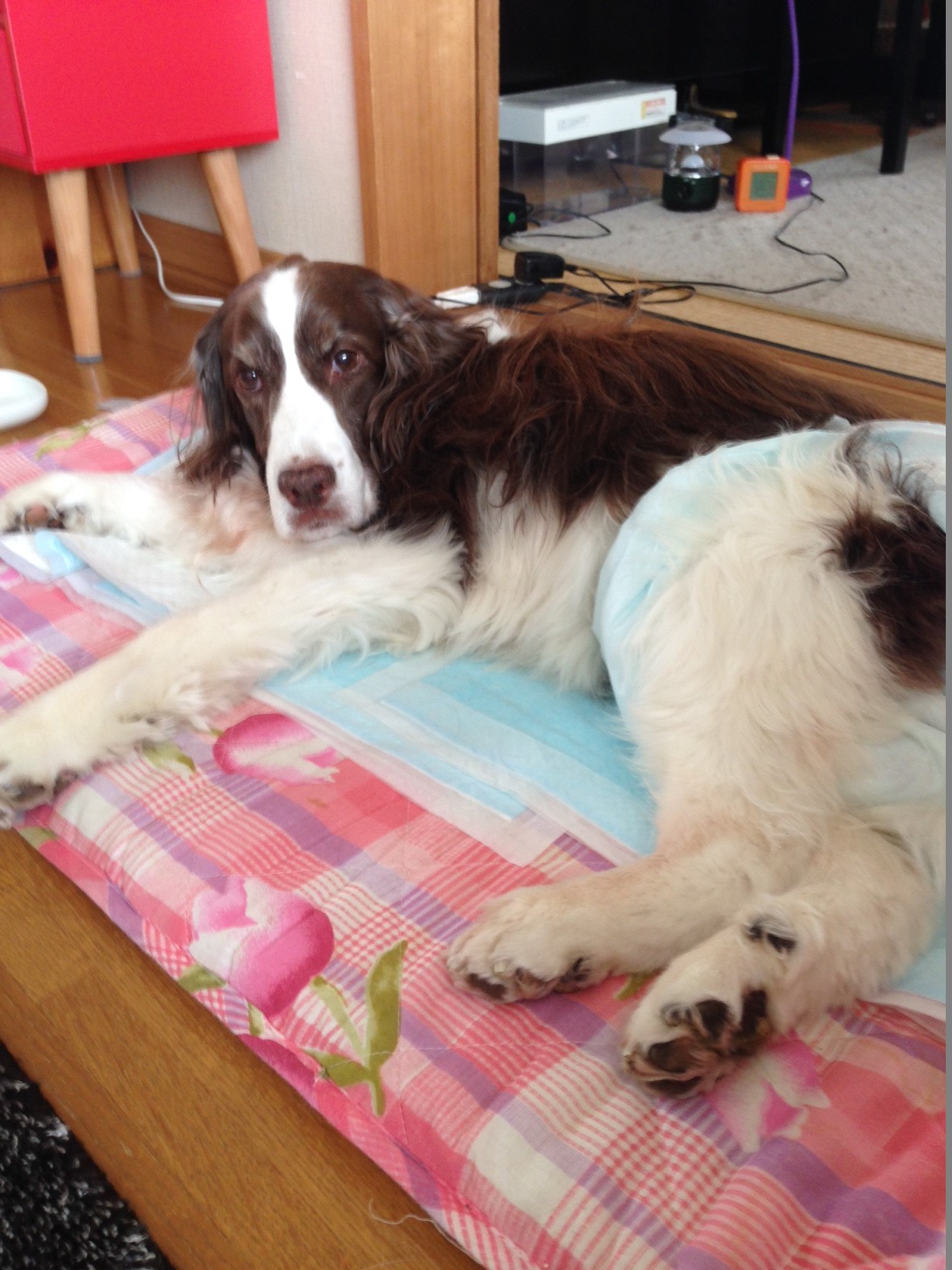 見た目はおむつ以外は入院前と全然同じ。 2018, 4/19 朝、俺が起きると、散歩に行かなきゃ、という感じで落ち着かず、ちょっとだけ外に抱いて出たら満足したのか今はぐっすり寝てるよう。 かみさんが寝られてなくて、まずいなあ。俺も仕事を最低限だけにしてるんだけど、なんだか、ドレミのせいにして仕事をさぼってるような気もし、でも、仕事するために生きてるんじゃないし、とか、そんなこと考えずに、学校にいる間だけでも効率的に仕事こなさないとな。講義も笑顔でやらなきゃ。 しょうがないからちゃりの練習時間を削る。まあ、そりゃそうだな。できることはしてやらないと。後悔はしたくない。 通院して皮下点滴など。今日は大好きな杉野さんがお見舞いに来てくれ、立ち上がってお迎えできたらしい。外も少し歩いたり、外の水道から水を飲んだり、ピンポンが来たら立ち上がったりもした。相変わらずなにも食えないのだが、犬は食わずとも2週間くらい生きるらしい。ふぶきは全身が老衰してたけど、ドレミは基本元気だし、体力もあったからな。 カテーテルが詰まってまだ元気だったら、膀胱瘻しますかとかの決断もしなくてはいけないのかも。しなけりゃ膀胱破裂だから、そうなりゃイチかバチかするしかない、って結論は出てるんだけど...全身麻酔で術中に死ぬかもしれないし、腎臓が悪いんだから、予後がいいわきゃない。 クローチングタバタもどき11回など。 2018, 4/18 色々あって200 kmくらいしか乗れてないけど、結構シャカシャカ音がする、ワコーズチェーンルブ。以前試したときもそんな感じ。キュルキュルいうわけじゃないから実質的に問題はないのかもしれないが、あまり気分はよくない。 まえたに動物病院の前を通るたびに顔がぐしゃぐしゃになる。生きてろよ、もうすぐ迎えに行くから。 ドレミを家に連れてきた。寝たきりみたいな感じだったが、家に連れて帰ると立ち上がり、バリケンに入ってやっぱり出て、風呂まで匂いを嗅ぎに行ったが、戻ってきて立ち尽くしていたところでかみさんに座らされ、寝かされ、あとはそのまま寝たきり。 歩いてるときは、これじゃあ紙おむつを引き裂いてカテーテル抜いて自殺行為するんじゃないかと思ったが、そんな元気はやはりないよう。でも、目がまだ知性を感じさせるので、すぐ死んでしまう感じでもない。 めしは食わない。水は少し飲む。カテーテルを閉塞させないためにも飲ませてる感じ。でも、めしが食えない限り、時間の問題ではある。 取りあえず通院することにしたものの、かみさん腰痛くしないか心配だ。 2018, 4/17 ふぶきの場合(2008年2月〜4月)は、よれよれになってからもなんとか1か月ほど庭で排便・排尿させており、ステロイドで一時的に持ち直したりしながら、おむつになって、飲まず食わずになってからは数日で死んでしまったようだ。どれみの場合は、既に飲まず食わずで、しっこがでないってのがきつい。 ケトンのない1か月のようだ...っていうか、ただでさえ気持ちが暗いのに、これでケトンなんか出たらやってられん。ふぶきが死んだしばらくは酒量もがっつり増えてたな。そのあとリーマンショックでこてんぱん。 今週は、暖かくていい天気が続いたり、拘束される時間が少なかったり、いいこともあるさ。どれみだってまだ死んだわけじゃない。取りあえず安心できる自分の家に帰って来いよ。看取ってやるから。 かみさんが昼間に会いに行ったが、かみさんを見てもほとんど反応なく、座らせれば何とか姿勢を保ち、立たせればよろよろ数歩歩くくらいで排尿体勢はとらず。その後、極細のカテーテルを通し、何とか尿をぽたぽた出すことに成功したらしい。 明日家に連れ帰って看取ることにした。何とか痛みを和らげて安らかに死なせてやりたい。 2018, 4/16 先週あたりからややおかしかった犬が、ややまずい感じになっているので病院に連れて行ったらそのまま検査入院。急激に来た感じ。まだ10歳なんだが。 R8000のフロントブレーキは軽くてよく効いて、新型のシューのせいもあるんだと思うが感触もいい。5800のリアブレーキは相変わらずやや重であまり効かないけれど、中華シューのせいもあるな。 ややまずいどころじゃなかった。胃と腸の間くらいにできてるでかい腫瘍が膀胱を圧迫すれば頻尿、胃を圧迫すれば吐き気、さらにそれが少し裂けて血が溜まってるらしい。入院して点滴とか注射で何とか体調を回復して全身麻酔してCTを撮り、手術できれば手術ということだ。 手術できなければすぐだと思うし、できても以前のように元気に走り回ることはなく、長くはないだろう。急にでかくなったというのはやっぱりガンだよな。で、悪いことにかみさんがインフルエンザ罹患。もー、どうにもこうにも。 ペットは普通人間より短命だ。わかってんだけど涙が出ちゃうわ。泣きながら走ってチャリとか車で事故らないように気をつけよう。 2018, 4/15 全く期待できない天気なので、暇に任せてチ