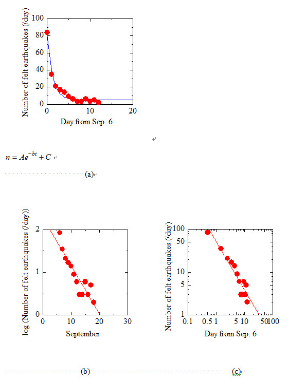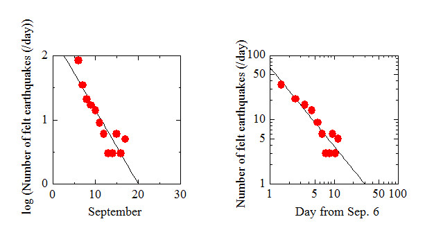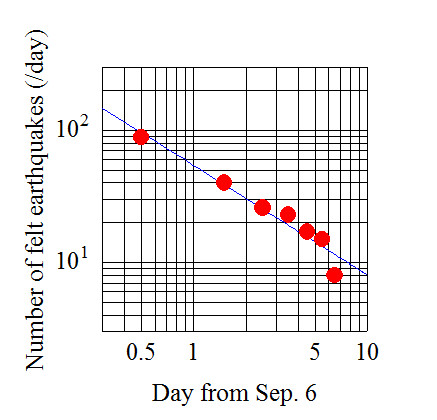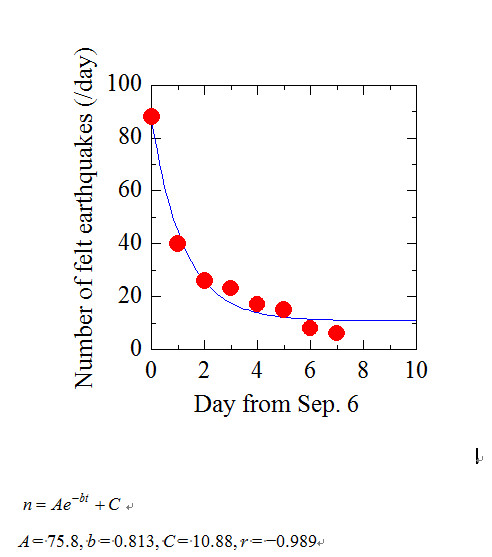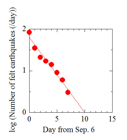 こういうほうがいいかな。一日の事象数が1個を下回るのは11日後。だから9月17日でほぼ終息と予想される(?)。なお、このグラフでは胆振地方中東部とラベルされたものだけカウント。震源が深くて、ややでかいのでないと有感地震にカウントされないというのがすこしやりづらい。 いずれにしろまだ危ないよ。やれ風評被害だ、もっと観光に来てくださいとか、言わない方がいいんじゃないかな。金のためとはいえ、責任とれないでしょ。 しばらく前から例のアトピーみたいのが出てる。あー、どうしてだあー。やだなあー。フルグラ?あせも?足指拡げで雑菌がついた? 2018, 9/13 やっと昨日で10事象以下になったけど、